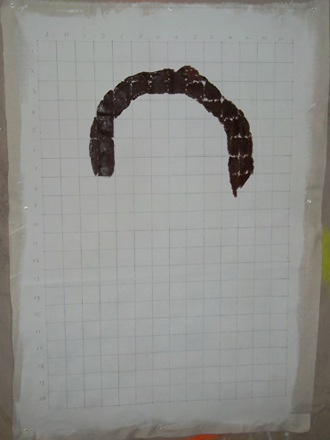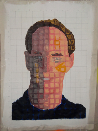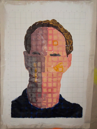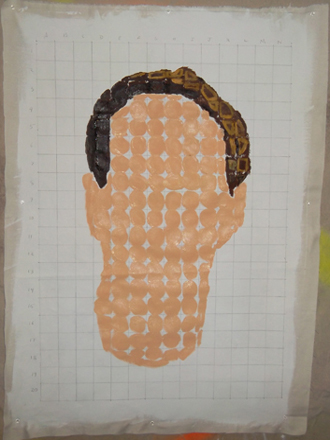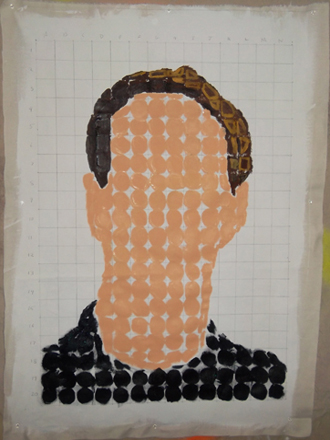 Slide : I have added my hair to the picture. Initially I was trying to fill in the entire square, but as the painting progressed I found in easier to just paint a large dot.