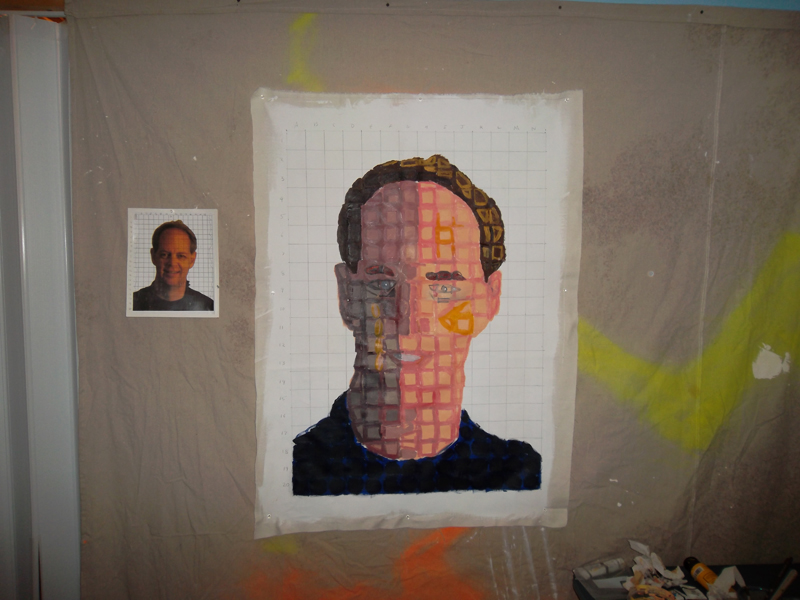 Most of the work by Chuck Close is very large, 9 feet tall, which is way too big for an experiment, so I chose a size larger than our class exercise, where we are using 1/2 inch squares on a grid. I chose 2 inch squares which resulted in a 28" x 40" picture. I purchased a large piece of canvas, cut it to the desired size, applied gesso and once dried, lightly sanded it and drew the grid. Using the original photograph as a guide. I worked square by square. Initially filling in the square with a large circle of that square's base color. I then outlined each square in another color, hoping that from a distance the final picture might at least resemble the original.